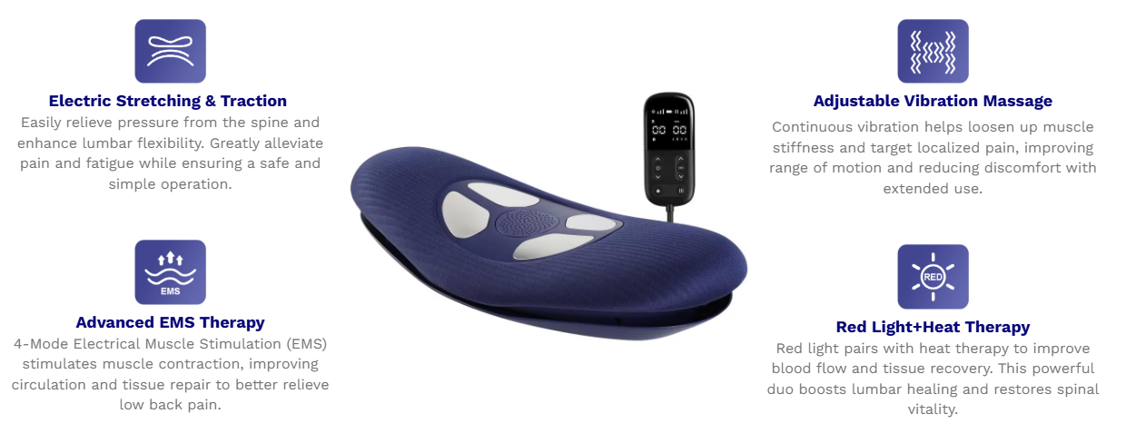 Back pain and spinal discomfort are complex issues, so they often deserve a multifaceted solution. Our Electric Lumbar Stretcher delivers a blend of therapies that work together to relieve tension, reduce pain, and support natural healing.